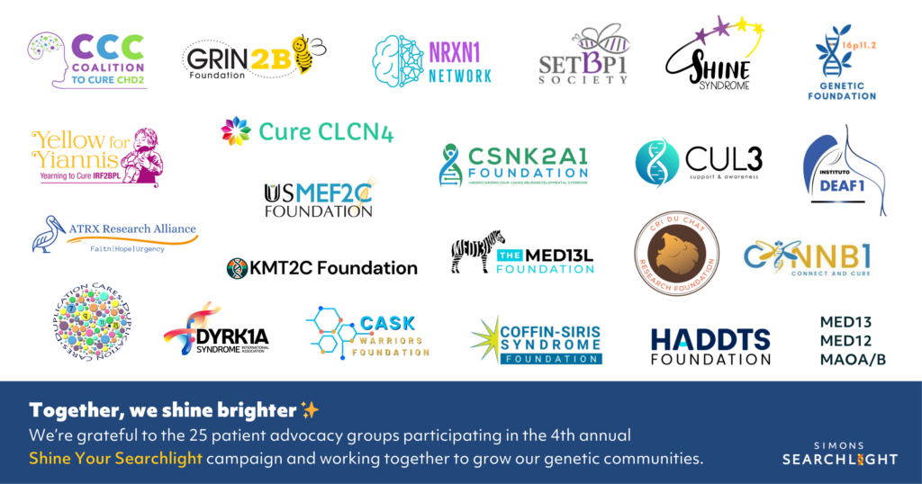 Shine Your Searchlight is a collaborative outreach campaign designed to support individuals, families, and caregivers affected by rare genetic neurodevelopmental conditions—while strengthening long-term research participation across the Simons Searchlight community. This year’s campaign is made possible through partnership with 25 patient advocacy groups (PAGs) who are helping share clear, accessible messaging and trusted resources with their communities.